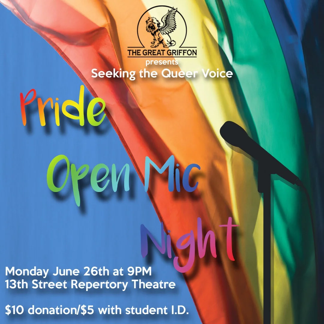 The Great Griffon celebrates PRIDE with on Monday June 26th at the historic 13th Street Repertory Theatre. We'll supply the drinks and the stage, you just bring yourself and your PRIDE! Everyone will get 5-10 minutes for the open mic to show off the talent they are most proud of.